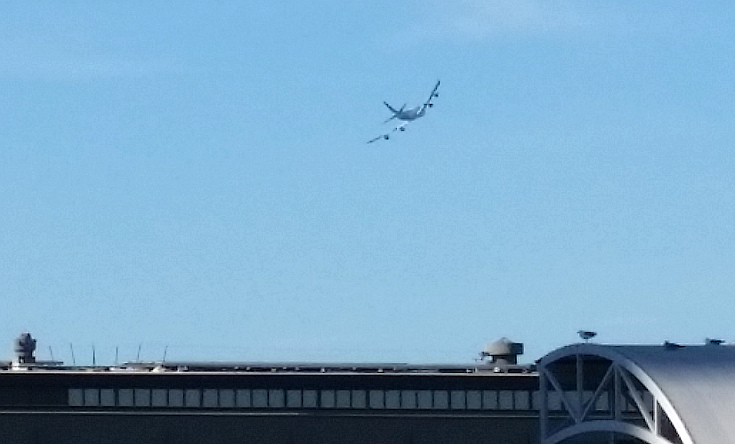 A United Airlines 747 participated in the air show, flying low over the crowd.