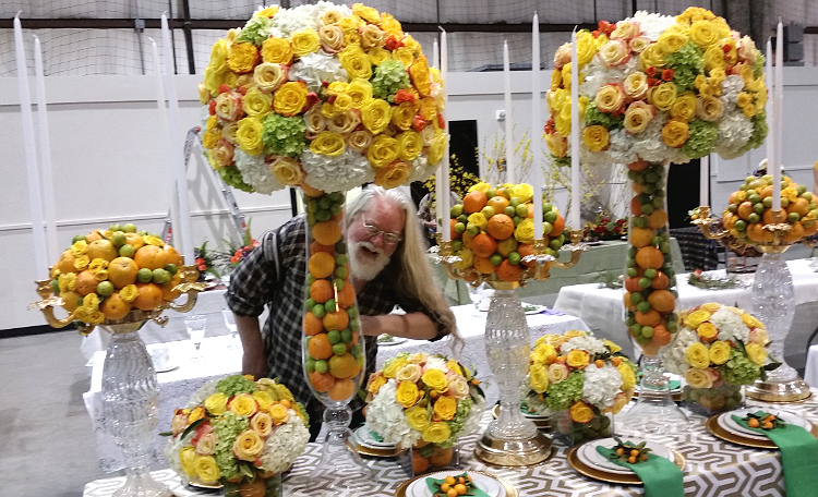 Ken is trying to hide in this beautiful display of flowers and citrus.