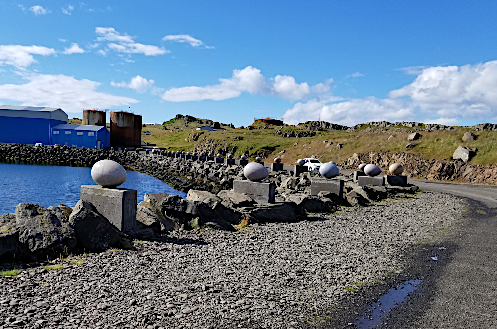 We stop next at a small port town where we find rocks that look like large eggs lining the roadway.