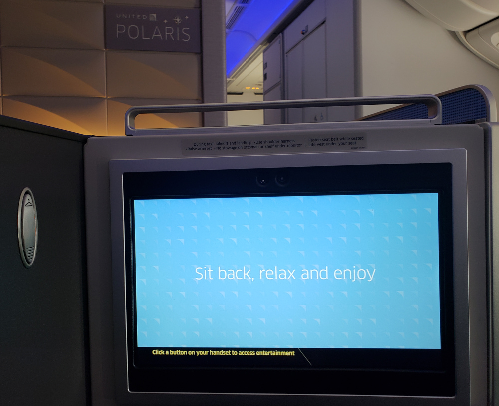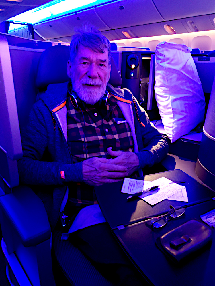 Larry's seat in the Polaris lounge on our United 777
