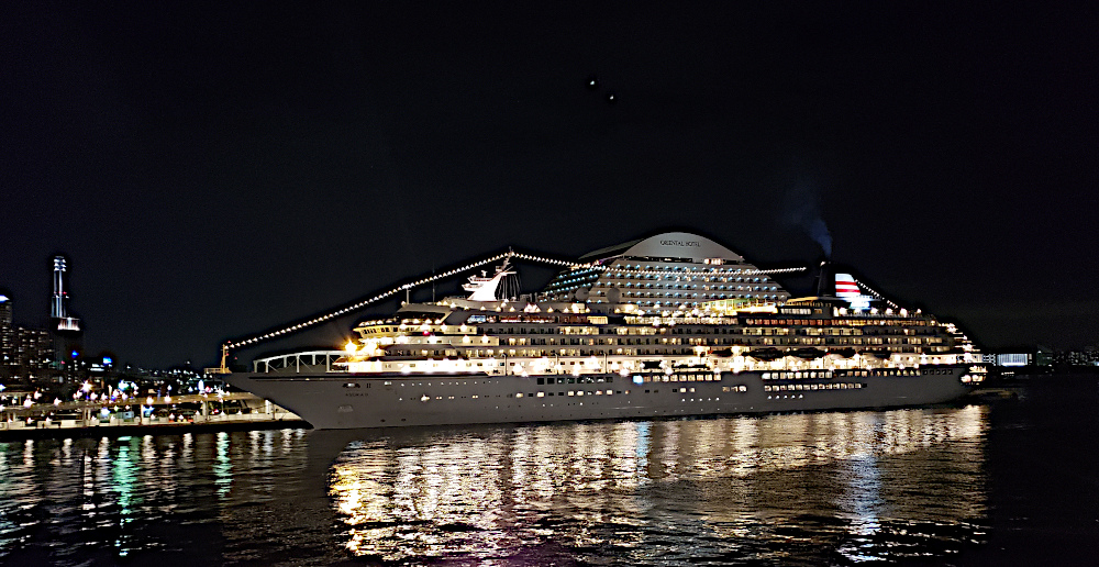 On the way to dinner we see from the bus a decorative port and a cruise ship