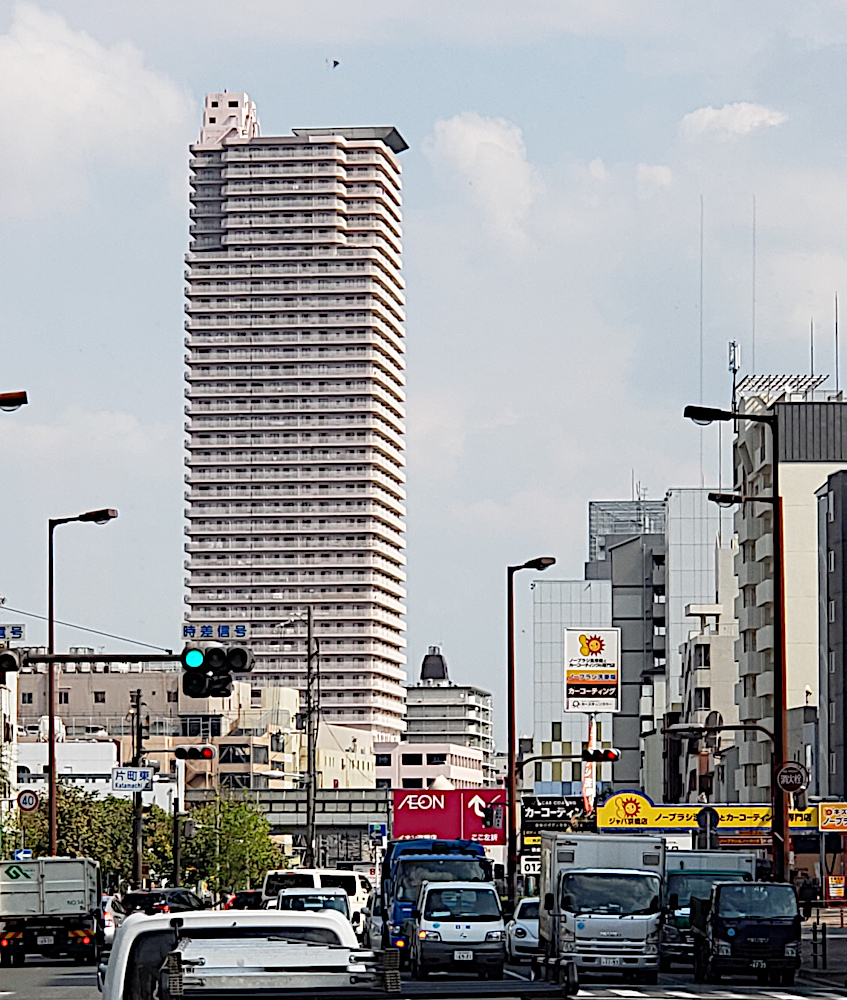Leaving the business district we find an tall office building or hotel, apartments and lots of street traffic.
